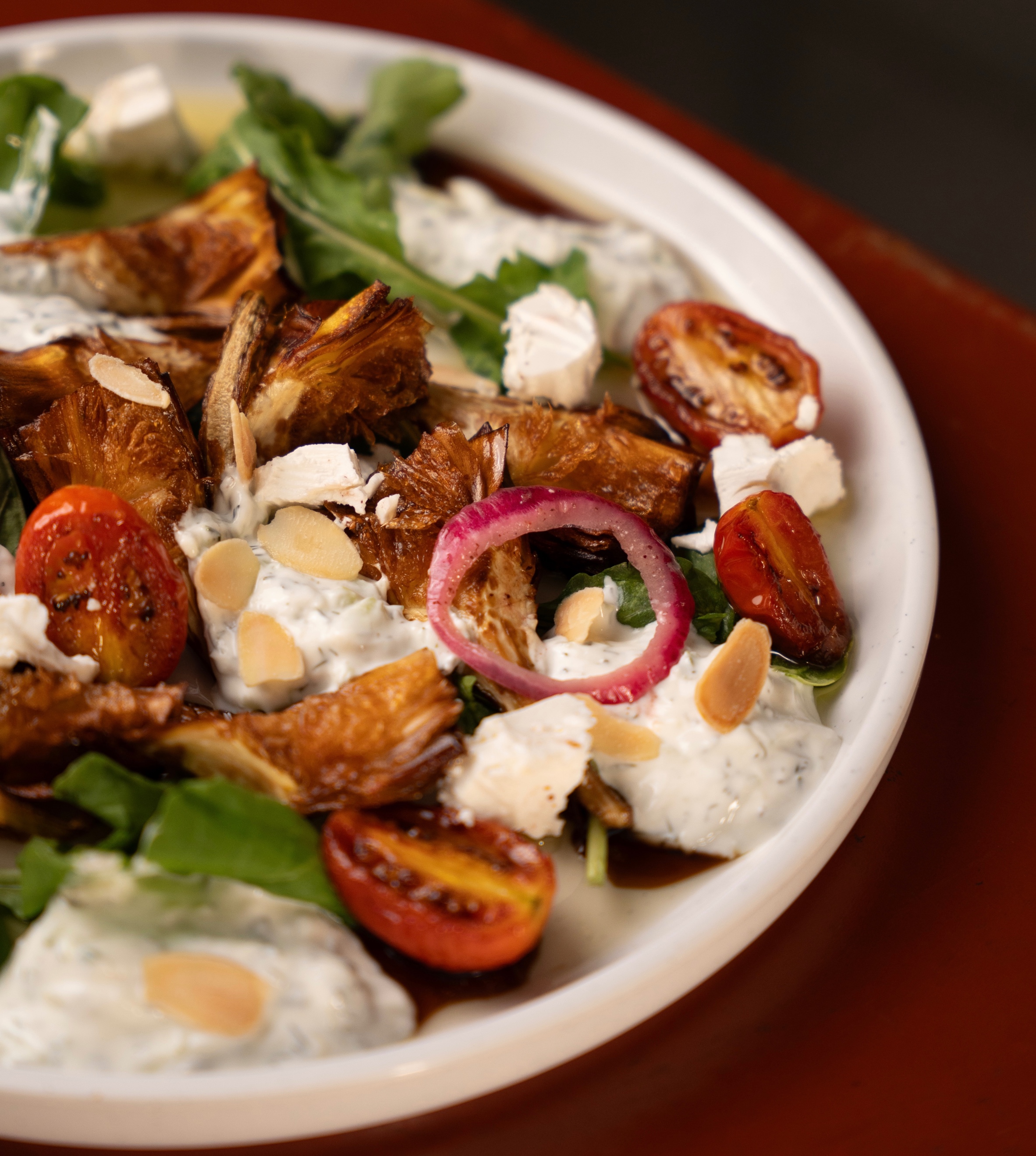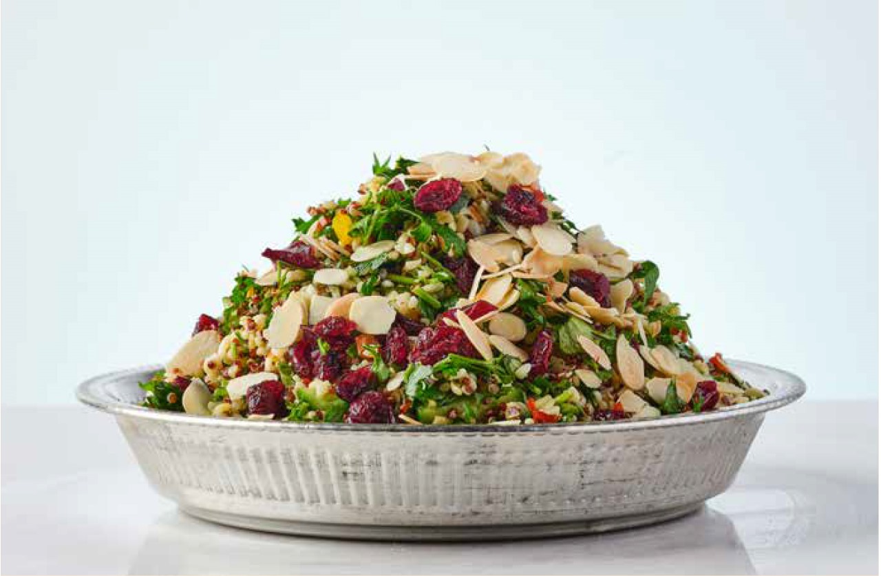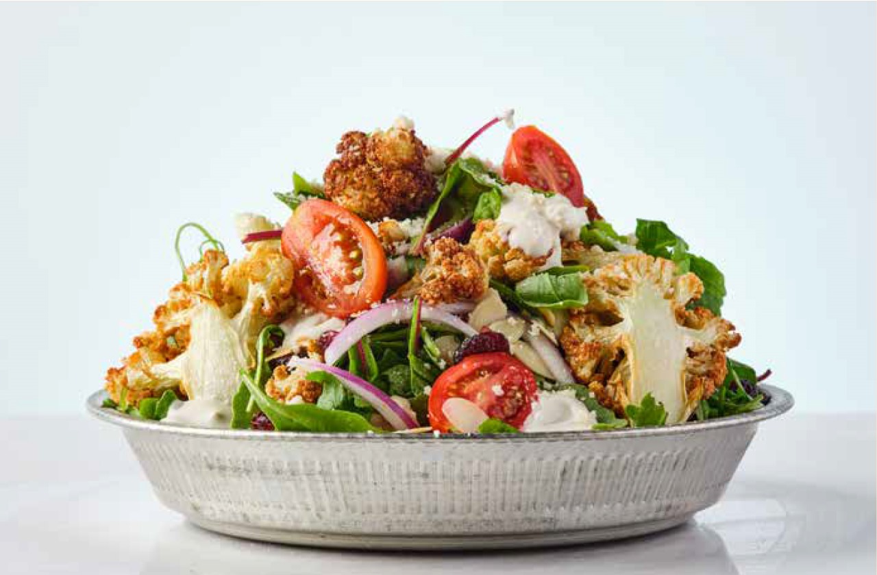 زهرة قرنبيط مع صلصة اللبنه والطحينه ، شيري ، زتون كالماتا ، بصل ، توت بري مجفف ، لوز ، جبنة البرمجان, جبنه الفيتا  ، جرجير, فينيجرت رمان