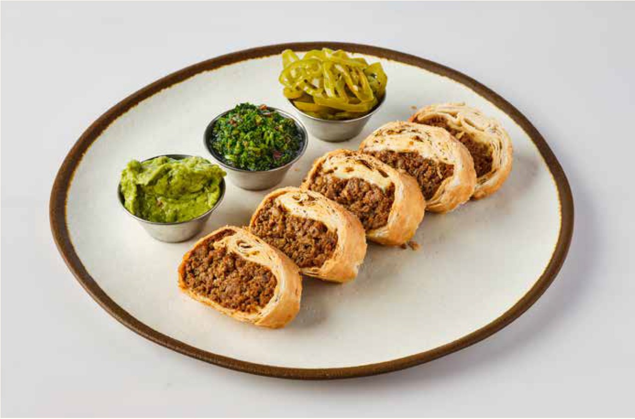 نقانق عجل تقدم مع بطاطا مهروسة ( بيري) مع صلصلة الشمينت والفلفل - تشيميتشوري - ثوم كونفي - بصل مقرمش - مع البصل الحامض - مطبوخة