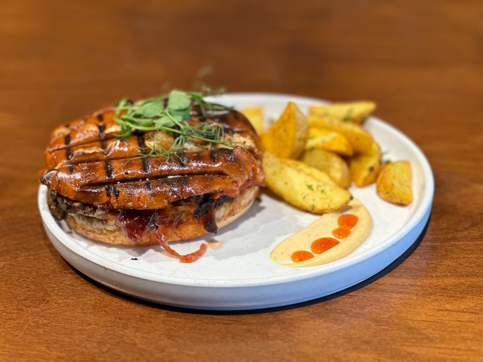 لحمه البقر  طازج سماش 150 غرام   , بانتشيتا خروف , ايولي خردل , جبنه تشيدر , بندوره مطبوخة , تطلة البصل , بصل مخلل ,باربيكيو ,