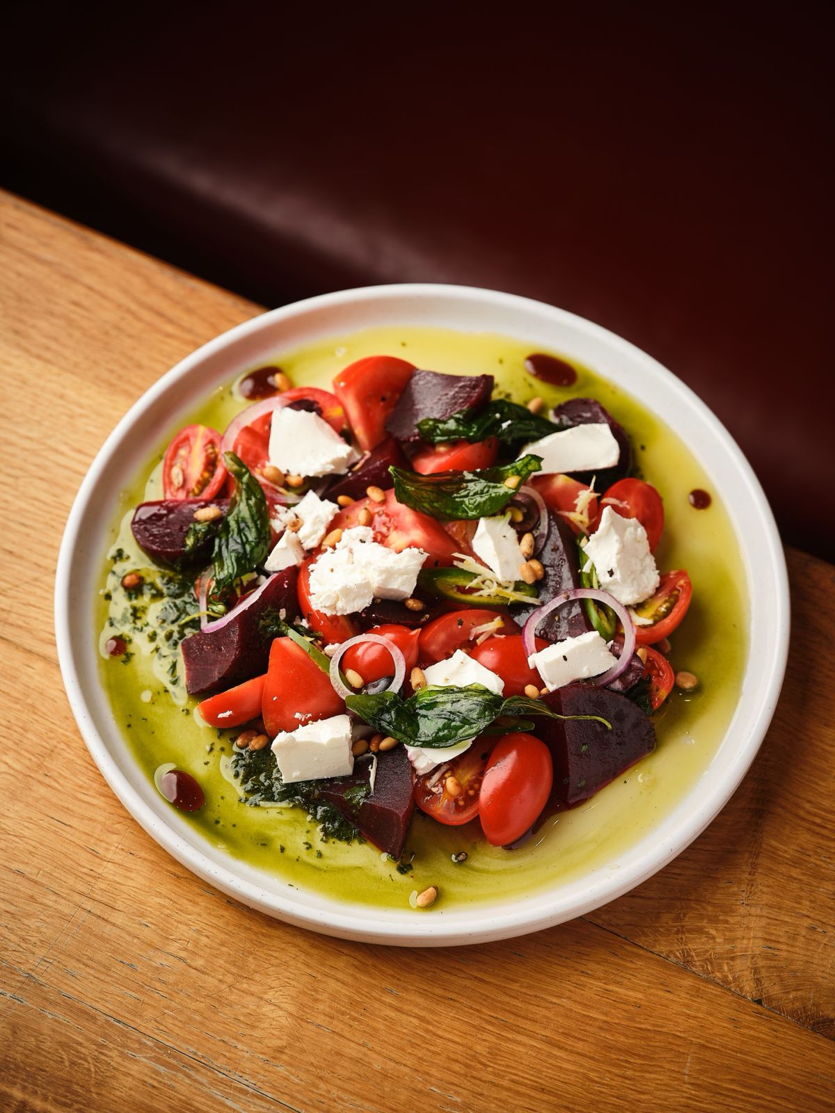 سلطتنا مكونه من بندوره - بندوره شيري - ليفت احمر مع البصل الاحمر والفلفل الحار -  بيستو - شرائح ليمون - مع زيت الزيتون والريحان