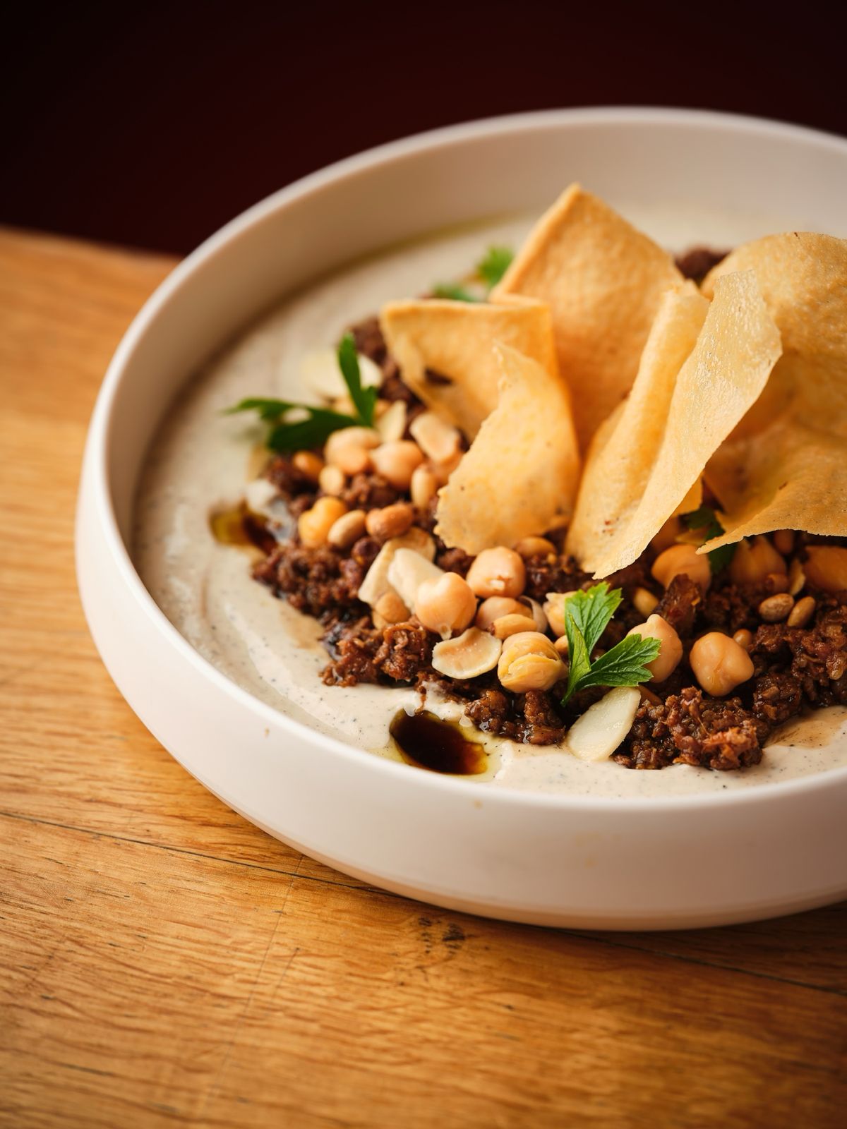 فتة بل لحمة االبقر الطازج والاسادو بنكهة حارة خفيفة - طحينة يوجورت - حمص حب - لوز - صنوبر - زيت زيتون - دبس رمان - وكلاج مقلي