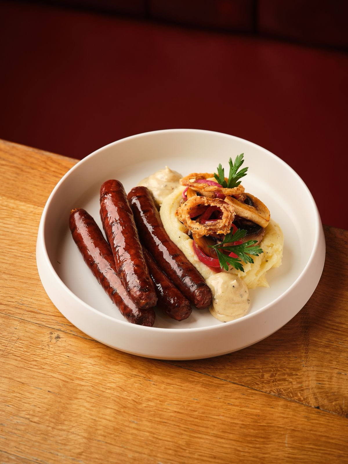 نقانق عجل تقدم مع بطاطا مهروسة ( بيري) مع صلصلة الشمينت والفلفل -