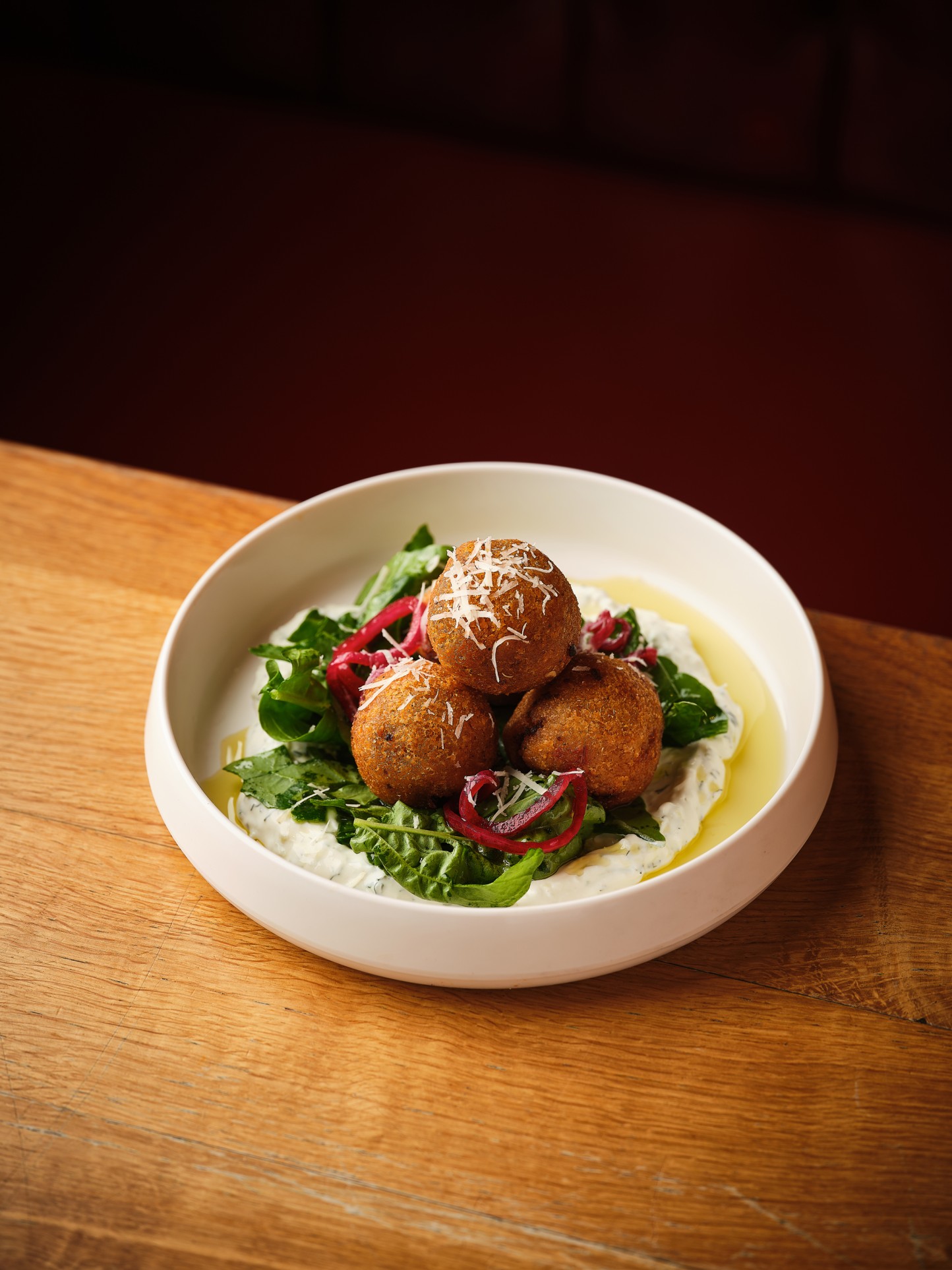 4 حبات كبه محشية باسادو مدخن مع لحم البقر الطازج تُقدم مع صلصة االسيزيكي مع جرجير وبصل حامض وجبنة البرمجانواليمون