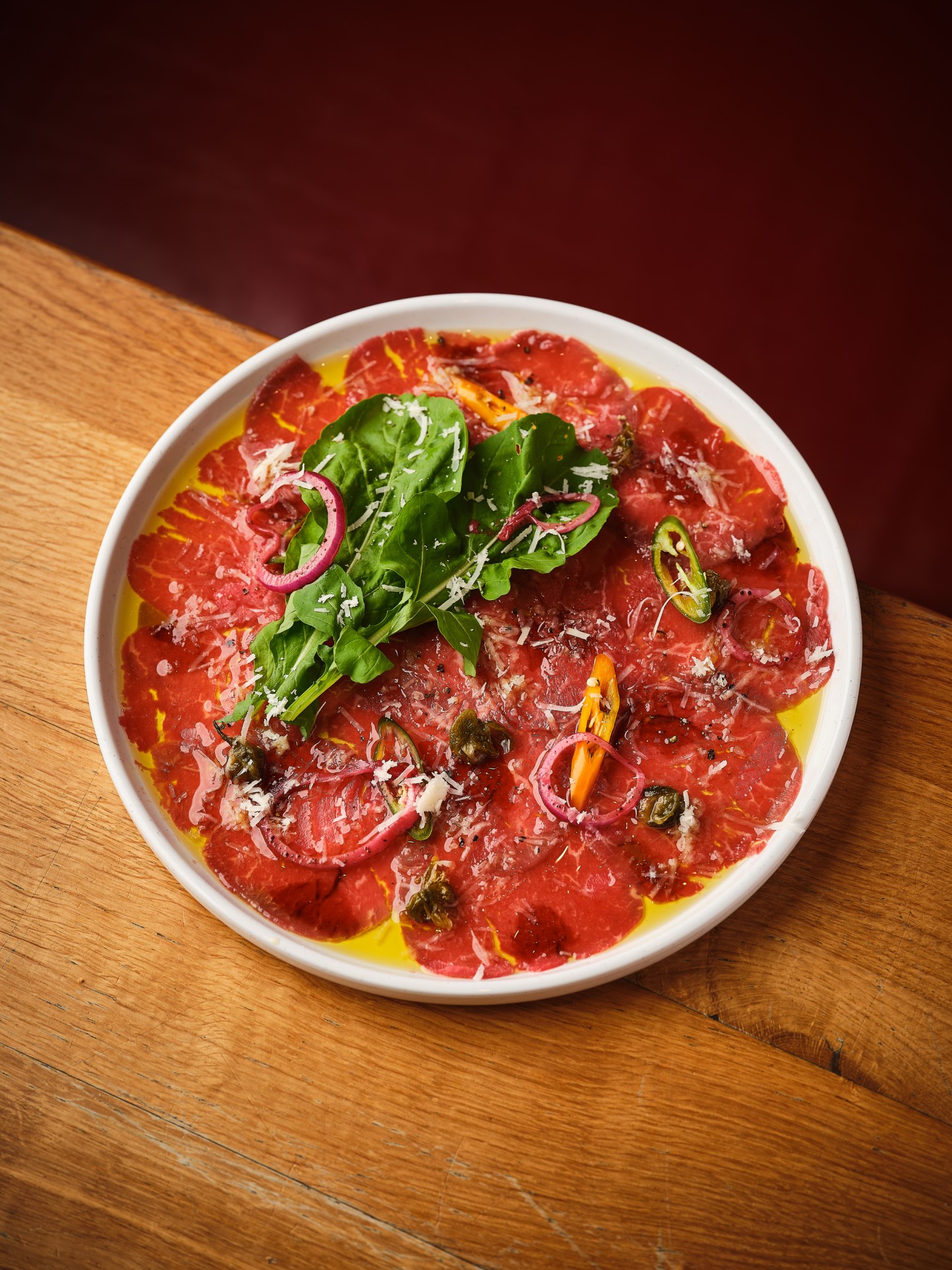 كرباتشيو مكونة من لحم عجل فيليه -زيت الزيتون -دبس الرمان -جبنة البرمجان -جرجير - فلفل حار والحصرم المكبوس يُقدم مع خبز