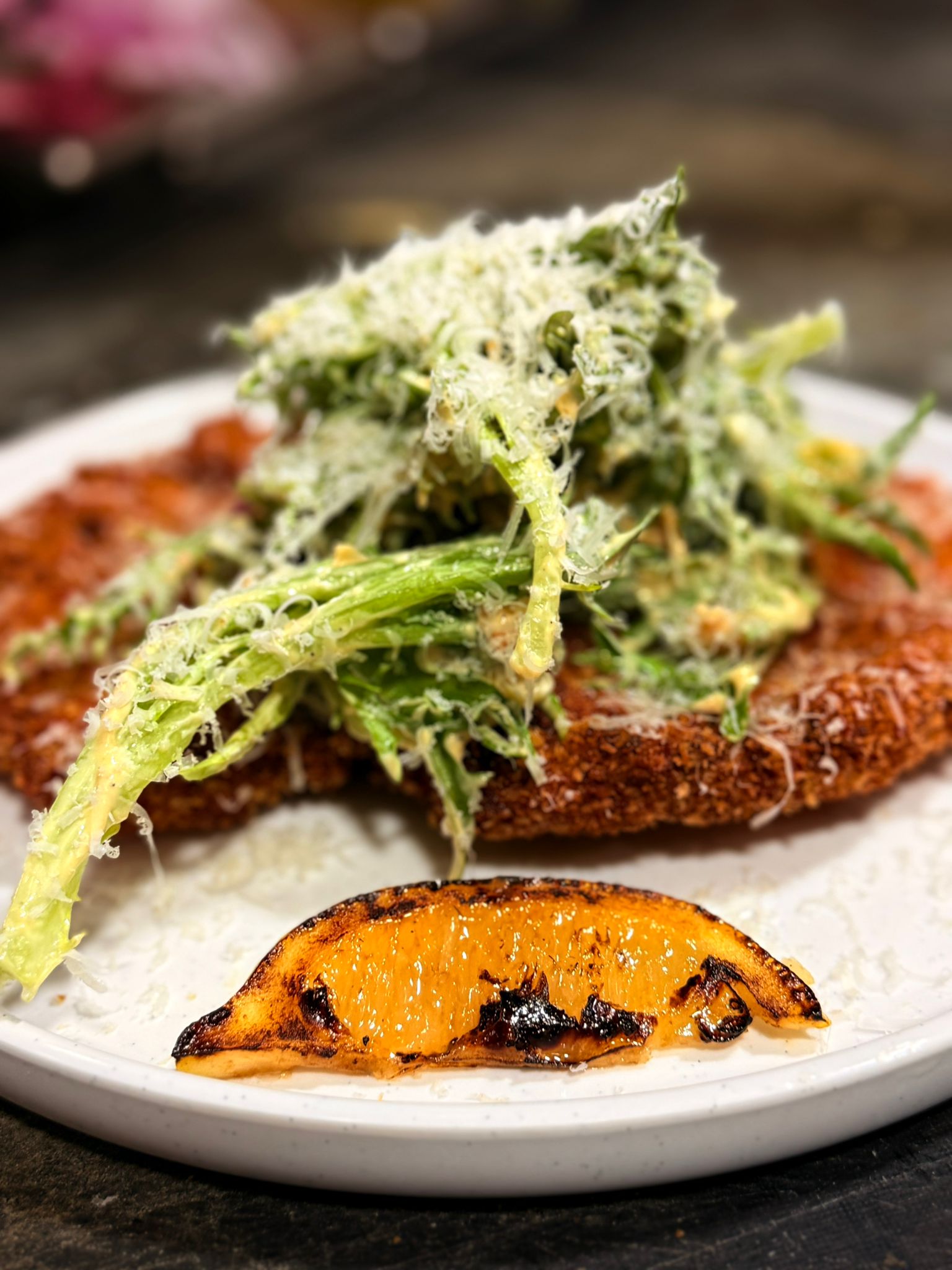 شنيتسل البقر هو فيليه طازج يقدم مع سلطه القيصر , لوز محمص وجبنه البرمزان المبروشه